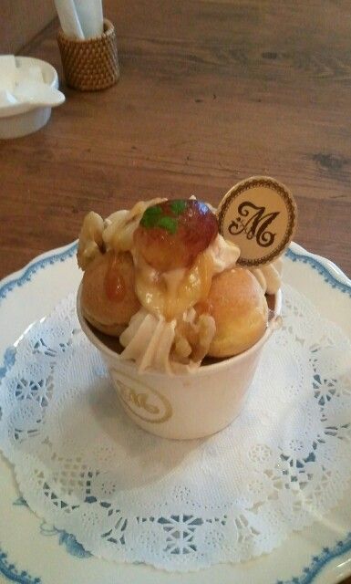 キャラメルバナナ味のカップケーキに、プチシューが乗ってる感じです